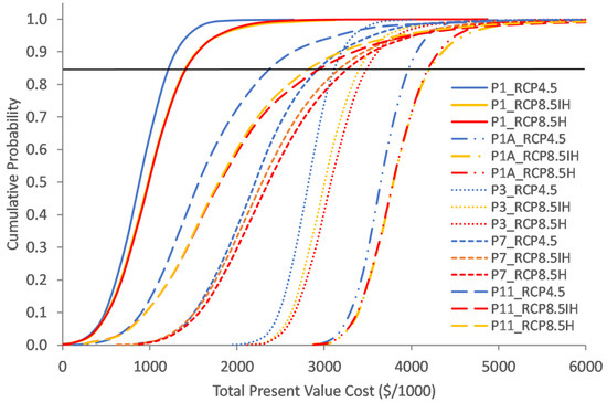 Probability distributions for total costs associated with pathways P1, P1A, P3, P7, and P11 for RCP4.5IL, RCP8.5IH, and RCP8.5H.