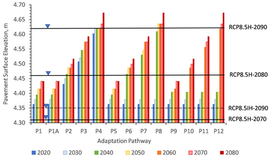 Pavement surface elevation at the pavement evaluation site relative to the mean sea level (MSL) for the 13 adaptation pathways is shown by the bars for each decade from 2020 to 2080. The inverted triangle marks the projected groundwater-surface elevation for the indicated year and RCP/SLR scenario. The projected groundwater elevation is shown for years 2070, 2080, and 2090 for the RCP8.5H scenario and 2090 for the RCP8.5IH scenario.