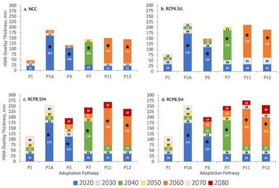 Cumulative HMA overlays required to maintain O-HMA thicknesses for select pathways. Colors represent the timing of the overlay. Overlay thickness in mm is indicated by numbers. Black stars mark the HMA thickness to be placed after base-layer thickening. Each chart represents: (a) NCC, (b) RCP4.5IL, (c) RCP8.5IH, and (d) RCP8.5H.