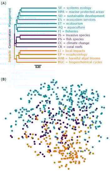 (A) Topics’ clustering: Hierarchical clustering (Ward’s method) of topics. The three resulting clusters were: management (light blue), conservation (dark violet), and impacts (orange). (B) Papers’ clustering: metric multidimensional scaling based on papers’ similarity in terms of shared topics. Color code as in Figure 2A.