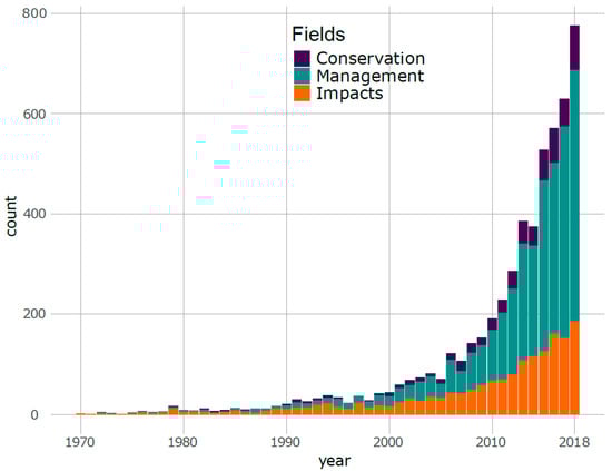 Our search also highlighted an exponentially growing interest in integrating ecological and economic issues during the last forty years, although this growth was mainly driven by the management field. This progress may stem from the disproportionate growth of purely economic studies in comparison with those having a more ecological connotation, such as the ecosystem conservation and the monitoring of the impacts exerted by human activities (Figure 3).