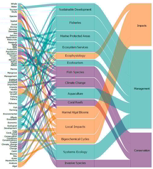 The overall aggregation of words in topics and of topics in fields is shown in Figure 4. Among all, the four most distinct topics (i.e., over the third quartile, coherence > 0.186) were coral reefs, harmful algal blooms, climate change, and fisheries. From the definition of probabilistic coherence, we can infer that these topics have a distinct identity because they share, with the other topics, the lowest number of associated words. Conversely, terms belonging to low-coherence topics (e.g., those belonging to the first quartile, coherence < 0.063), like invasive, populations, spatial, and development, resulted as quite diffused in marine ecology/economy literature and aggregated weakly into specific topics.