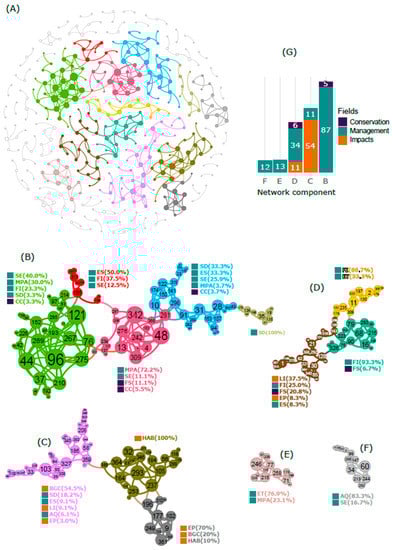 The third largest component (51 papers) of the information-flow network included three modules (Figure 5D), all strongly associated with the management field and mostly linked to large-scale fisheries. Overall, this component was characterized by evenly connected, structured modules, gravitating around the same topic. Notwithstanding their strong association with fisheries, each module maintained a distinct identity: namely, a broad, systemic module aggregated a wide range of papers (brown), and two more specific modules dealt with the general management of fisheries (dark green) and the repercussion of ecotourism over fisheries (yellow), respectively.
