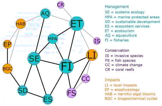 A central role in the information-flow that we draw from the reviewed literature is played by systems ecology (see SE in Figure 5B and Figure 6), a particular approach that applies general systems theory to ecological problems pertaining to both pristine and impacted ecosystems []. From our analyses, systems ecology already conveys solid knowledge transfer between environmental conservation, evaluation of anthropogenic impacts and management of habitat and natural resources, such as fish stocks. Nonetheless, systems ecology is still weakly linked to both (i) conservation studies dealing with biodiversity and the climate change effects (IS, CR, FS, CC in Figure 6), and (ii) biogeochemical investigation, such as those about the nutrient cycling and plankton blooms (HAB, EP, BGC, LI in Figure 6).