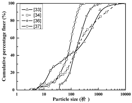 PPFA is the lightest component of solid residues generated during wood combustion, and its specific gravity ranges from 2.4 to 2.8 [34,35]. The bulk density ranges from 150 to 1300 kg/m3, with an average value of 500 kg/m3. The density decreases with increasing carbon content [34]. The particle size varies considerably and is largely dependent on the degree of biomass combustion. The average particle size is 150 to 250 μm, which closely matches high-calcium coal fly ash [35,36]. As shown in Figure 1, different PPFA samples have wide particle size distributions ranging from 1 to 10,000 μm [33,34,36,37]. The surface area is in the range of 4200 to 100,600 m2/kg, which is more than 200 times that of class C coal fly ash [35,37,38]. The high surface area of PPFA is attributed to particle fineness, the high irregularity of particle shapes, and its more porous nature [39]. These properties also lead to increased adsorption properties as well as higher rates of leaching [35,39]. PPFA has a high moisture holding capacity due to its hydrophilic nature, and the particles also tend to agglomerate [16].