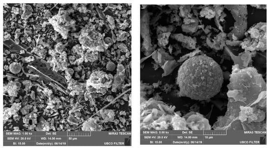 PPFA has a heterogeneous mixture of particles of varying sizes and shapes [33,34,53]. Figure 2 depicts the scanning electron microscope (SEM) images of a PPFA sample procured from a pulp mill based in British Columbia, Canada. The images, which were captured using a Tescan Mira 3 XMU SEM, reveal irregular and angularly shaped inorganic particles with thin layers of crystalline structures. These irregular particles are essentially hydrophilic in nature and absorb water into their pores through capillary action simultaneous to the hydration of oxides [15,34,36]. There are many agglomerated particles and a few spherical particles as well. Some particles have a porous cellular form: they are the remains of unburned or partially burned wood [33].