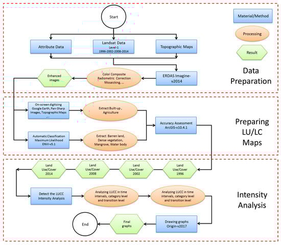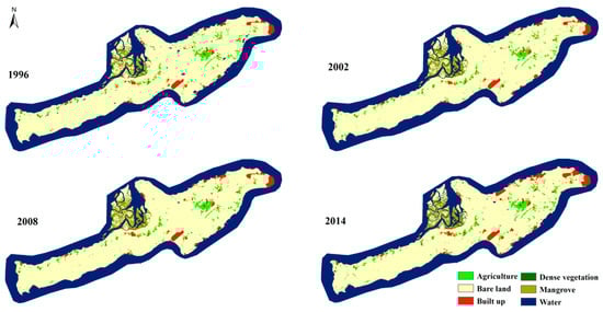 Then, masks were prepared for the two extracted classes, and supervised classification was used to automatically extract four other classes including dense-vegetation, mangrove, water body, and bare-land from the images. Maximum likelihood classification method, which is still one of the most common supervised classification algorithms [28] was used at this stage. To conduct a supervised classification of satellite images, the training data must be determined precisely. Selection of the training data is the most challenging and critical part of the supervised classification method [29,30,31]. The training points were obtained using Google Earth images, topographic maps (including maps of constructed lands, roads, and airports), and Landsat pan-sharped images. Then, six extracted classes were combined to prepare four time intervals in the GIS environment, and final maps were provided for change detection step. Finally, to verify results of this step, error matrix as the most common method of evaluating accuracy regarding using remote sensing data [32] was formed to measure accuracy of the maps. This matrix is the result of a comparison between the pixels including known pixels or ground control pixels with the corresponding pixels in the classification results. Figure 2 illustrates the overall framework of this study.