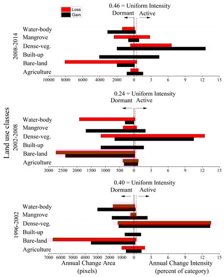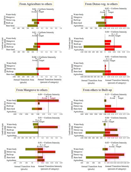 Figure 6 illustrates the intensity of the observed transitions for agriculture, dense-vegetation, and mangrove classes according to the amount of gained pixels for all the three-time intervals. If a bar passes the uniform line in the graph, it indicates that the category’s gain targets the losing category, while stopping a bar before the uniform line indicates that the category’s gain avoids the losing category. As it appears in graphs, valuable classes (built-up and agriculture) have no active role as a supplier of land for other classes while the bare-land has been main supplier for built-up land in all the three-time intervals. As shown in Figure 6, bare-land and dense-vegetation tend to be main targets of mangrove loss in the first and second periods; however, in the third period, water-body gained more intensively than bare-land and dense-vegetation classes. Bare-land tends to be targeted more intensively by the built-up than other classes in all the three periods.
