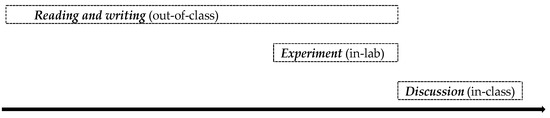 The activity was designed to be multi-task to encourage students to reflect, experience, and debate social values in and out of the classroom. Students carried out different tasks: (R) reading and writing (out-of-class), (E) experiment (in-lab), and (D) discussion (in-class). Figure 2 shows the chronology of the whole activity we hereafter call RED–‘Reading–Experiment–Discussion’.
