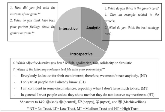 After the MTG experiment, students were asked to answer a questionnaire consisting of two blocks of questions. The first block related to sociodemographic characteristics (studies, gender, economic autonomy, and housing). The second one included a questionnaire based on the theory of multiple intelligences [31] concerning interactive, analytic, and introspective dimensions (see Figure 3).