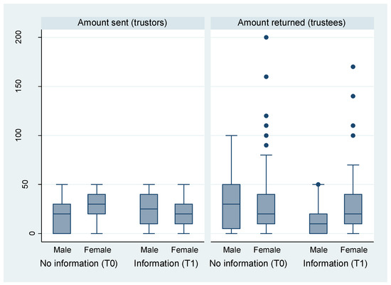 We also investigated any gender effects through H3 and H4. Figure 4 presents the box and whiskers plots of students’ decisions grouped by gender and treatment. In line with H3, we first observe that female trustors’ decisions were significantly different from those of male trustors in both treatments. Compared to T1, in T0 females transferred a higher median amount than males. One interpretation of this result is that males and females react in a different way when they are provided with information on their partner’s earnings.