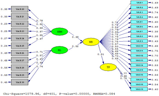 Lisrel 8.7 was applied to test the mediation effects of employee well-being. The mediation model showed an acceptable fit (, df = 401, = 2.69 < 3; NFI = 0.95; NNFI = 0.97; CFI = 0.97; IFI = 0.97; RMSEA = 0.084 < 1). The path estimates showed that the employee well-being played a significant role between HRM and task performance, and responsible leadership and task performance, respectively. The mediation model shows in Figure 2.