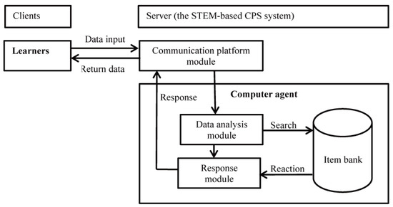 Consequently, our application includes three elements. The first is the application’s design. Four CPS experts were invited to help with the application’s development and provide guidance on the problem scripts [9]. Eight problem-solving tasks were developed (fastening shelves, using a microwave, placing water, organizing a bedroom, traveling, buying a phone, building a home, and designing furniture). The second element is a platform for interaction between the application and learners. Learners were able to register with and log in to the application’s platform and then choose problems to solve and collaborate with agents. The platform presented critical information about each problem so that learners could discuss, share, and understand problems with computer agents. Learners communicated with computer agents using keyboards and entered responses or selected items that appeared onscreen. The third element is an item bank. The item bank plays an essential role in the CPS learning application, as it collects information from CPS specialists and previous users. Computer agents provide information that can be retrieved from the item bank in response to a learner’s input. All learners’ input data were also recorded to evaluate learners’ CPS performance.