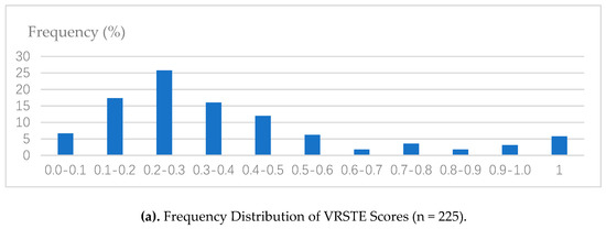 The mean VRSTE of the sample households is 0.669, which means the farm households could decrease their inputs by 33.1% and still generate the same amount of farm and off-farm income. The result is quite close to another study covering a similar sample and a slightly more recent time-period, which generates a VRSTE of 0.664 at the farm level including only agricultural production activities [59]. This suggests that management skills are consistent across farm and off-farm activities. And here we should note that substantial variation exists in technical efficiencies for the sample households (SD of 0.209). The distribution shows that 176 (78.2%) of households had technical efficiency scores greater than 0.5, and 15 (6.7%) of them had a VRSTE of 1.0 (technical efficient).