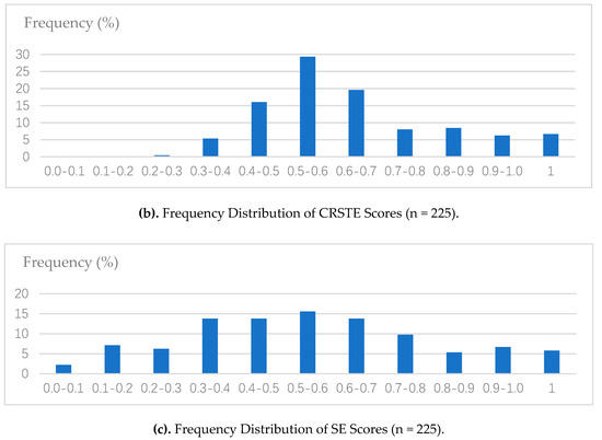 Technical efficiencies of the farm households under both the constant returns to scale assumption (CRSTE) and variable returns to scale assumption (VRSTE) with an output-orientation model were estimated applying DEA-Solver Pro 5.0. Descriptive statistics and frequency distributions of the efficiency scores at the household level are presented in Table 2 and Figure 1.
