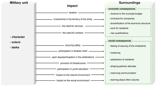 The intensity of the military links with local communities is conditioned by many internal and external factors. Social, economic, and environmental links analyzed in the context of sustainable development indicate that the military, as a state institution, in addition to providing the public good, in the form of national defence for the general public, contributes to building the potential of the territory where it is located. This contribution can be identified in relation to the military’s impact on local labor markets (increase of employment), the income situation of the inhabitants (stabilisation of revenue level), the size of the local budget (in urban municipalities—revenue from property tax, in rural municipalities—revenue from agricultural tax), the size and quality of public services (annual sustainable revenues from military units), the intensification of trade and the financial health of the companies that provide products and services to individuals.