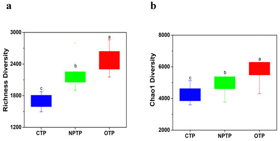 Diversity indices based on 16S rRNA gene of bacterial community in tea plantation soils under different management practices. (a) richness index; (b) Chao1 index. Different letters represent the significant difference among soils at p < 0.05. OTP: organic tea plantation, NPTP: non-polluted tea plantation, CTP: conventional tea plantation, similarly hereinafter.
