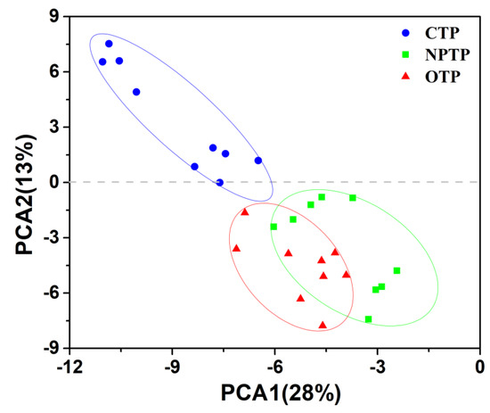 A total of 549,196 high-quality reads (OTP soil, 169, 251; NPTP soil, 164, 928; CTP soil, 215, 017) were obtained from 30 samples by utilizing high-throughput sequencing analysis. The rarefaction curves of OTUs tended to approach the saturation plateau, indicating that the range of sequencing coverage was enough for downstream data analysis (Figure S1). Richness (Figure 1a) and Chao1 (Figure 1b) indices were used to compare the alpha-diversity of microbial communities in tea plantation soils under different management practices. The results showed that the alpha-diversity of soil community was ranked as follows: OTP > NPTP > CPT, indicating that there were significant differences for bacterial diversity among OTP, CTP and NPTP soils (p < 0.05). In addition, we further analyzed the beta-diversity of microbial communities in tea plantation soils under different management practices, and PCA of microbial communities revealed a clear separation between CTP soil and both of OTP and NPTP soils, while a partial overlap between OTP and NPTP soils was observed (Figure 2). The dissimilarity tests of bacterial communities in tea plantation soils under different management practices were carried out using ANONISM and MRPP based on Bray-Curtis distance, and the results showed that there were significant differences in soil bacterial communities among OTP, NPTP and CTP soils (Table S1). In brief, we concluded that there were significant differences for alpha and beta diversity among OTP, CTP and NPTP soil bacterial communities.