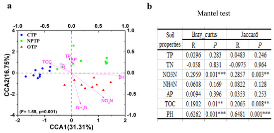 Table 1 shows the physicochemical properties of tea plantation soils under different long-term management practices. The TOC and NO3-N contents and pH values in OTP soil were significantly higher than those in NPTP and CTP soils. No significant difference in TP content was observed among OTP, NPTP and CTP soils. The CCA plots of microbial community structures and soil properties showed that pH as well as TOC and NO3-N contents were the three longest vectors (Figure 4a). Furthermore, a partial Mantel test (Figure 4b) based on both Bray-Curtis and Jaccard distances also demonstrated that pH as well as TOC and NO3-N contents were key physicochemical factors in assembling the microbial communities of tea plantation soils under different long-term management practices (pH, p < 0.001; TOC, p < 0.01; NO3-N, p < 0.01).