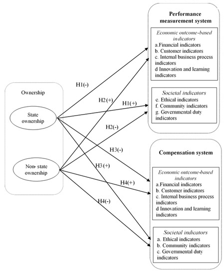 The extant research, so far, only paid very limited attention to ownership characteristics as being a possible contingent variable to explain differences in the design and use of PMSs. Prior studies that focused on the relationship between ownership characteristics and the design and use of PMSs included only one type of ownership characteristic as a research variable in the research design (e.g., family vs. non-family firms) (see References [8,9]).These studies did not compare differences across ownership characteristics in a single country, except for a few studies investigating the design and use of PMSs in subsidiaries of multinational organizations [10,11,12,13,14,15]. Recent calls were made in the literature to study the influence of family ownership on the design and use of management control systems (MCSs) [16,17,18,19,20]. However, in most economies and especially emerging economies, different types of firm ownership are found beyond private family ownership. In a number of emerging economies, state ownership is still very much present. Therefore, we broaden this call for research on the influence of ownership characteristics on PMSs to examine the influence of the relationship between ownership differences spanning from 100% state ownership to 100% private ownership and PMSs and the linked outcome-based compensation systems. Whereas the few available studies investigating firm ownership influence on PMSs focused only on the presence of economic indicators in PMS, we focus on broad-scope PMSs, which include sustainable and societal indicators in addition to economic indicators. In order to study the relationship between ownership characteristics and the design of PMSs, we focus on broad-scope PMSs including economic goals, as well as sustainable and societal goals.