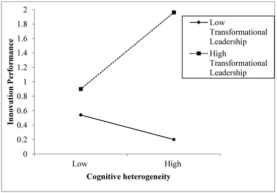 Therefore, in the study of heterogeneity and innovation performance, the resource-based theory and social identity theory are strengthened and the view of conflict is weakened. This result shows the importance of boundary-spanning disciplines, which is consistent with the work of Whalen (2018) [48]. In addition, the application of leadership theory to innovation in the university is broadened. The results show that transformational leadership has a significant moderating effect on the relationship between cognitive heterogeneity and innovation performance, while it does not have a significant moderating effect on the relationship between discipline heterogeneity and organisational heterogeneity. In other words, cognitive heterogeneity promotes innovation performance in the context of a transformational leadership style. This means that transformational leaders can reduce the negative impact of heterogeneity on team creativity and promote the collision and exchange of ideas and knowledge. Transformational leadership encourages team members to adopt an open and inclusive approach to different viewpoints and values, thereby increasing the creative motivation of team members by encouraging them to utilize diverse cognitive resources [34,35]. Based on the moderating effect of transformational leadership on the relationship between cognitive heterogeneity and innovation performance, it can be seen that the transformational leadership style is not effective in relation to discipline heterogeneity, which is static, but plays a positive role in relation to cognitive heterogeneity, which is dynamic. Therefore, special attention must be paid to the application of the transformational leadership style to the cognition of team members.