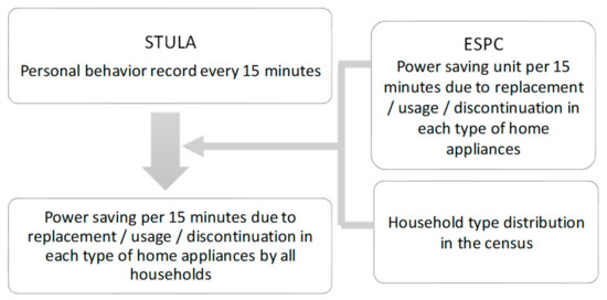 where indicates the amount of power saving by households of type M in the census, taking power saving behaviors related to home appliance l in time slot t. By summing up for all l, Equation (3) estimates the total power savings in time slot t by households of type M.