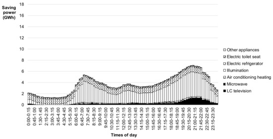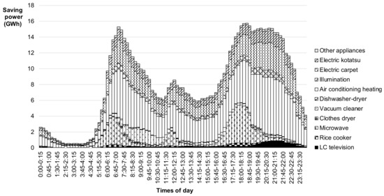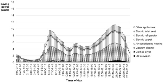 As shown in Figure 4, the power saving effect by discontinuing the use of home appliances, particularly the use of heating devices such as air conditioners, is the largest. The time at which the power saving potential becomes particularly large is twice a day (around 07:00 and 18:00). At those times, not using microwave ovens brings about a large power saving effect. Between 07:00 and 10:00, not using vacuum cleaners also produces a significant power saving effect. It should be noted that Figure 4 shows the power saving potential due to discontinuing the use of household appliances and also shows the potential power consumption by using them. Because the assumption that everyone discontinues all use of home appliances is not realistic, it is impossible to achieve the total amount of power saving potential shown in Figure 4. However, people who think that it is unnecessary to use home appliances at a certain time period could stop using them, or they could stop using useless home appliances, so that a part of the potential shown in Figure 4 may be achieved. In addition, referring to Figure 4, people can stop using home appliances during times when social power consumption is high, and can move the use of home appliances to times when social power consumption is low.