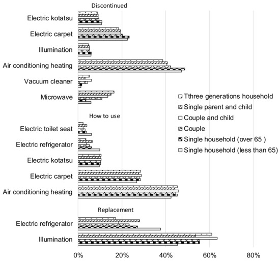 Figure 5 shows the contribution ratio of each home appliance to each power saving potential for households with different attributes. In a household with any of the attributes specified, home appliances with large electricity saving potentials include illumination equipment and refrigerators (for replacement), and heating equipment (for devising and discontinuing use). These home appliances are those that are assumed to be in operation all day, or during times other than sleeping. In households with few family members, these home appliances have a high share of the power saving effect. On the other hand, in households with a large number of family members, the influence of home appliances used in response to individual behavior (group A appliances in Table 1 such as LC televisions and microwave ovens) is increased.