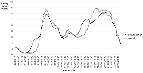 We examined the effect when Group A appliances (home appliances used according to specific behaviors) in Table 1 are used two hours earlier than the current situation. Figure 6 shows the maximum power saving potential caused by discontinuing the use of home appliances in winter, when Group A home appliances are used two hours earlier than the current situation. In Figure 6, it is assumed that the home appliances of Categories B and C are used in the same manner as the current situation. We also displayed the current power saving potential in Figure 6. When Group A appliances are used two hours earlier, the power saving potential increases by 1.3% (2.3 GWh) between 09:00 and 15:00. Moreover, it was found that the difference between the maximum and the minimum value among power saving potentials at each point in the day is reduced by 9.6% by changing the use time of home appliances. This indicates that changing the time of use of home appliances increases the power saving potential in time slots when the electric spot price is high. This change stabilizes the fluctuation of the power saving potential of the day. Changing the time of use of this home appliance turned out to be effective, because it increased the power saving potential in the time period required and flattened the power saving potential between time slots.