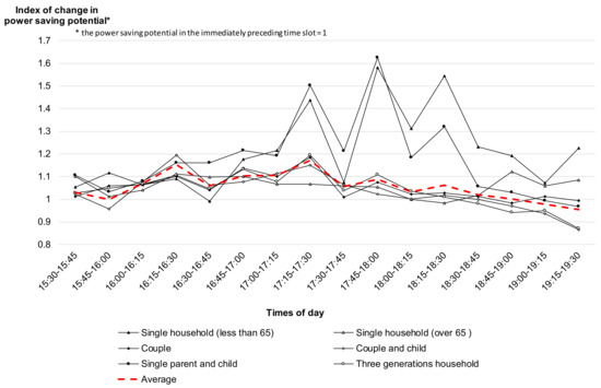 Figure 7 shows how much the power saving potential during a certain time period increases or decreases when the power saving potential in the immediately preceding time slot is set to ‘1′. Figure 7 shows the period from 15:30 to 19:30, where the rate of increase of the power saving potential relative to the immediately preceding time slot is particularly high. For an efficient power supply, it is considered that a sudden change in the power saving potential between time periods is undesirable. According to Figure 7, in single households (less than 65), single parent & child households, and three generations households, there are particularly severe fluctuations in power saving potential between time periods. On the other hand, in single households (over 65) and couple & child households, the change between periods is relatively small. The red dotted line shown in Figure 7 shows the average magnitude of fluctuation for each time period. This line is considered to indicate the situation where a CEMS is realized in each community and the fluctuations of the power saving potential between households offset each other. For example, with the introduction of the CEMS, it is anticipated that the major fluctuation at 17:30–17:45 will be relaxed by 33.1% in single parent and child households.