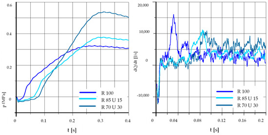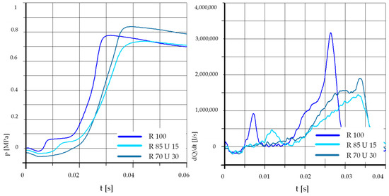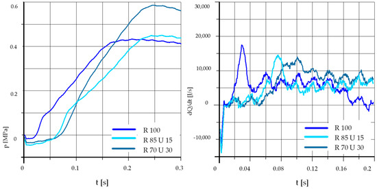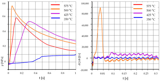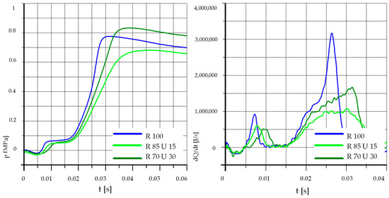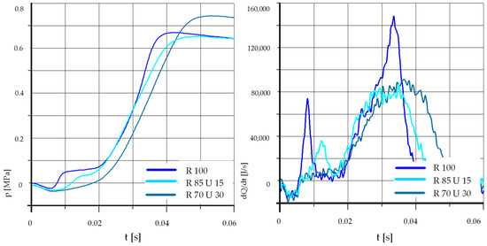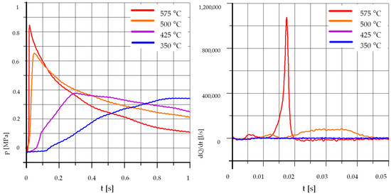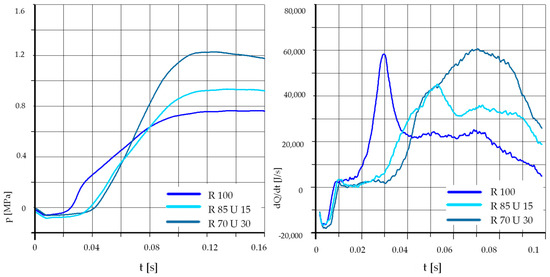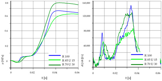 As a result of the calculations, the following parameters were obtained as a function of time: Smoothed pressure course in the test chamber [MPa]; pressure change rates [MPa/s]; average temperature in the test chamber [K]; heat release rates [J/s]; and amounts of heat released .