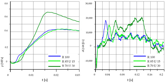 In Figure 7 it can be observed that the 15% addition of unleaded petrol did not improve the process parameters. The values of maximum pressure and heat release rates were even lower than for pure rapeseed oil. With the content of unleaded petrol equal to 30%, the maximum pressure increased, with a slight ignition delay and a slightly lower maximum value of the heat release rate.