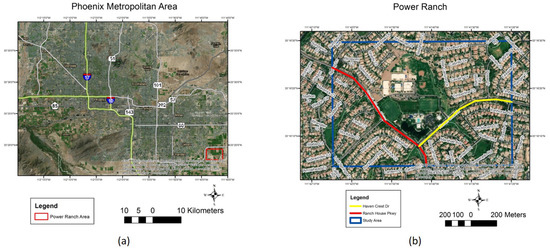 (a) Location of Power Ranch in the Phoenix Metropolitan Area, shown in the red box on the southeast corner;and (b) view of Power Ranch with the study area enclosed in the blue box and major collector streets marked in red and yellow (Source: ESRI [70]).