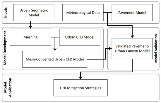 In order to create a validated model of the effect of pavements on the urban microclimate, an uncoupled pavement-urban canyon model was adapted from a previous study [78] and validated for the current one. This validated model was then used to study the effect of cool pavements. The steps used to develop, validate, and then use the model are summarized in Figure 4. The modeling effort consisted of two sub-models: A pavement model, which used a one-dimensional numerical method to calculate the surface temperature of pavements in the urban area; and a three-dimensional Computational Fluid Dynamics (CFD)-based urban canyon model to calculate the air temperature. The variable of interest was the 2 m air temperature, which corresponds to the Canopy Layer UHI. This is important, as most outdoor human activity takes place at this height and, so, it has the most significant impact on urban areas.