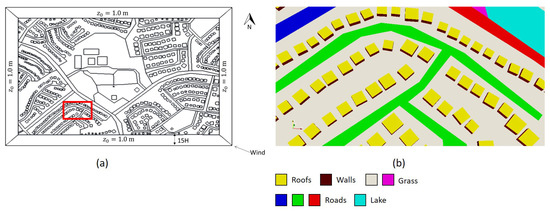 (a) Digital model of the study area, with computational boundaries and wind direction shown. (b) A close-up of the part of the study area highlighted in (a). H is the height of the buildings (5 m), while is the aerodynamic aerodynamic roughness length of the parts of the model where the buildings were not explicitly resolved.