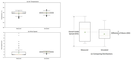 Box-plots of measured and simulated (a) air temperature and (b) wind speed at a 2 m height. The triangle in the middle of the boxes represents the mean value of the distribution. The definitions of Difference of Means (DM) and Overall Visible Spread (OVS) for comparing distributions are exemplified in (c).