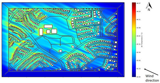 The simulated air temperature at a 2 m height for the Existing Pavements case is shown in Figure 8, with the wind direction (ESE) also marked. The temperature contours can be observed to follow the wind direction. As the air is heated by flowing over warmer surfaces, the residents in the northwestern part of the area experienced a higher air temperature, of over 44 C, representing a microscale UHI intensity of about 2 C. Temperatures were even higher immediately downstream of buildings, due to heating by the walls and roofs.
