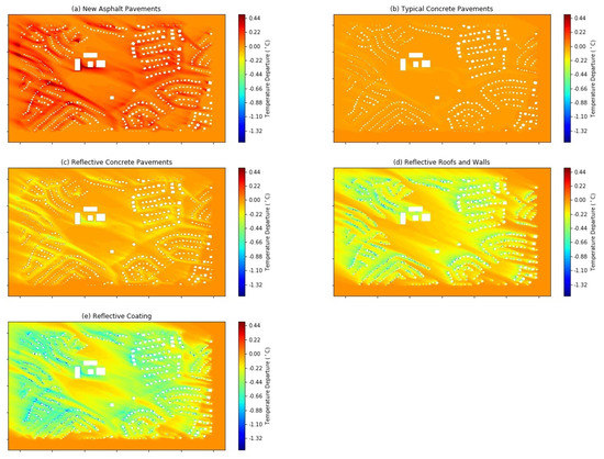 Air temperature differences at 2 m height from the Existing Pavements scenario, compared to the (a) New Asphalt Pavements, (b) Typical Concrete Pavements, (c) Reflective Concrete Pavements, (d) Reflective Roofs and Walls, and (e) Reflective Coating scenarios.