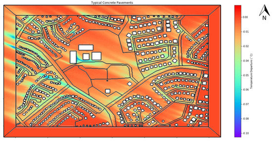 In the Typical Concrete Pavements scenario, there was very little change in air temperature. Figure 10 shows the temperature differences for this scenario on a finer scale. Again, areas downstream of the collector roads had a lower temperature, but the peak departure was only about −0.06 C in the northwestern developments. The vegetated surfaces had virtually no difference at all. Thus, simply resurfacing all the asphalt pavements with typical concrete in this neighborhood did not have any significant effect on the 2 m air temperature during the analysis period. This is possibly due to the relatively small area of the roads, with respect to other impervious and vegetated surfaces.