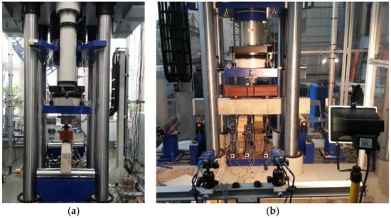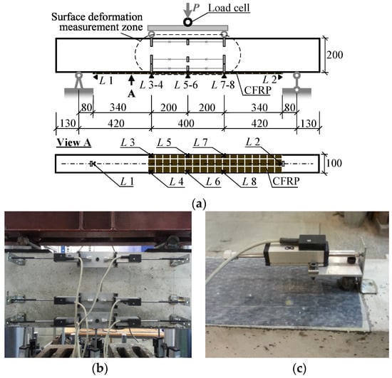 Vertical displacements of the beams were measured in the pure bending zone using linear variable displacement transducers (LVDTs) (L 3 to L 8 in Figure 2a). Three horizontal LVDT lines situated along distinct heights, as shown in Figure 2b were deployed for assessing the average curvature in the pure bending zone. The upper and lower LVDT lines were located respectively along with the levels of compression and tension reinforcement, whereas the middle LVDT line was set 50 mm higher than the tension reinforcement level. Slip displacement of the external sheets relative to the concrete surface was measured using LVDTs (L 1 and L 2 in Figure 2a). Figure 2c shows the instrumentation. The applied load was measured using a load cell. All measured data were automatically collected and recorded by Almemo 2890-9 data-logger. The specimens were mounted in a stiff testing frame, as shown in Figure 5a and loaded using a 5000 kN Walter + Bai hydraulic actuator with a loading rate of 0.2 mm/min. During testing, the development of cracks was monitored using a digital camera (Figure 5b), and the images were processed using digital image correlation (DIC) system with the aid of proprietary DaVis 8.1.6 software by LaVision.