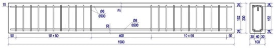 The experimental programme encompasses 18 composite beam specimens. All beams had cross-sectional dimensions of 100 mm in breadth and 200 mm in height, gross length of 1500 mm, and span length of 1240 mm. The beams were subjected to symmetrical four-point bending with a shear span of 420 mm (Figure 2a). Figure 3 illustrates the reinforcement detailing of the beams. For ease of reference, the beams are assigned distinct notations. The notations with “nm” refer to “non-metallic”, and such beams had 2 × ∅8 mm GFRP (glass fibre-reinforced polymer) tension reinforcement bars and 2 × ∅6 mm grade S500 steel compression reinforcement bars. The remaining beams were reinforced with 2 × ∅8 mm deformed steel bars as tension reinforcement and 2 × ∅6 mm deformed steel bars as compression reinforcement. To prevent shear failure, ∅6 mm steel stirrups were provided at 50 mm spacing along the shear spans.