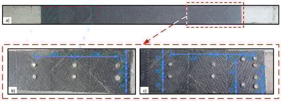Mechanical fastening of external CFRP sheets (dimensions in mm): (a) Adhesively bonded CFRP sheet; (b) The 2 × 6 pins layout; (c) The 2 × 10 pins layout.