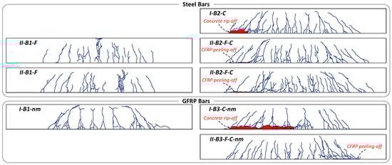 Figure 6 depicts the final crack patterns of the beams belonging to the first two specimen series. This figure also describes the failure mechanism of the beams. In the figure, the specimens are divided into two groups with respect to the type of internal bar reinforcement. Identical specimens have the same notations (see Table 1 for the reference). It is found that beam specimens cast from steel fibre-reinforced concrete with external sheets exhibited larger number of cracks. This would be due to the combined effects of fibres and CFRP sheets in transferring tension stresses across a major crack, thereby increasing the stiffness and fracture energy dissipation. This synergy effect is even more apparent in conjunction with the GFRP bar reinforcement. As visualised from Figure 6, the rip-off of concrete was a typical failure mode for the specimen cast from ordinary concrete (I-B3-C-nm); whereas in the presence of steel fibres, the fibre reinforcement played the role to transfer the failure from the concrete to the interface zone, thus resulting in peeling-off the CFRP sheet (II-B3-F-C-nm). This improves the repairability of the beam, and it was achieved notwithstanding substantial differences in the compressive strength of ordinary concrete and steel fibre-reinforced concrete (the values were respectively, 50.6 and 31.6 MPa). The observed failure mechanisms indicate that the incorporation of fibres is more promising than increasing the concrete strength in ensuring the structural integrity of the specimens.