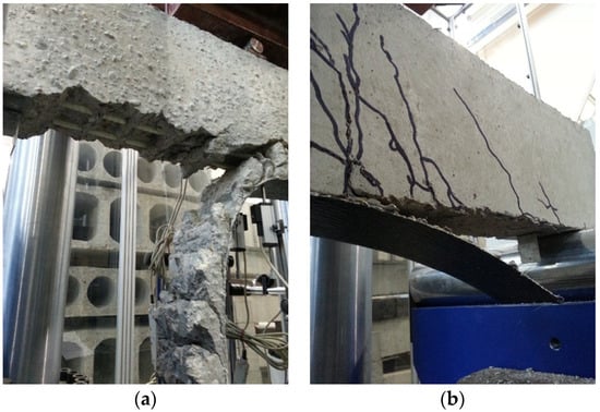 Splitting failure of the concrete cover at the level of tension reinforcement was a notable characteristic of the specimens without steel fibres. Figure 7a demonstrates an example of such an occurrence. For specimens cast from steel fibre-reinforced concrete with a bonded external sheet, the failure was signified by debonding of the CFRP sheets at the concrete-adhesive interface. Figure 7b shows the corresponding failure example.