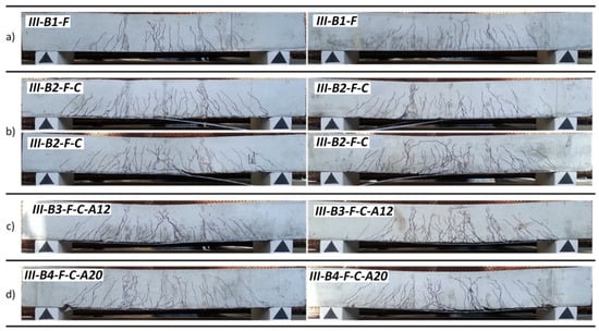 Figure 8 depicts the final crack pattern of the series “III” beams (Table 1). The identical specimens have the same notation. Similar to the previous two specimen series (Figure 6), the multiple cracks distributed throughout the bonded zone indicated the desirable synergy effect of the composite specimens: the smeared crack pattern along the tension zone is characteristic of the externally bonded beams, and it is noteworthy that the major cracks only formed at relatively high load levels where the load was approaching the yielding of reinforcing steel. As visualised from Figure 8b, the peeling-off of CFRP sheet was typical failure mode for the specimens with pure adhesive bonding of external sheets, whilst the additional mechanical fastening (hybrid jointing) assured adequate fixing of the external sheet up to ultimate loading stage (Figure 8c,d). The external sheet also enhanced the load-carrying capacity of the beam specimens, as demonstrated by the test results of bending moment at failure (Table 2) and discussed later.