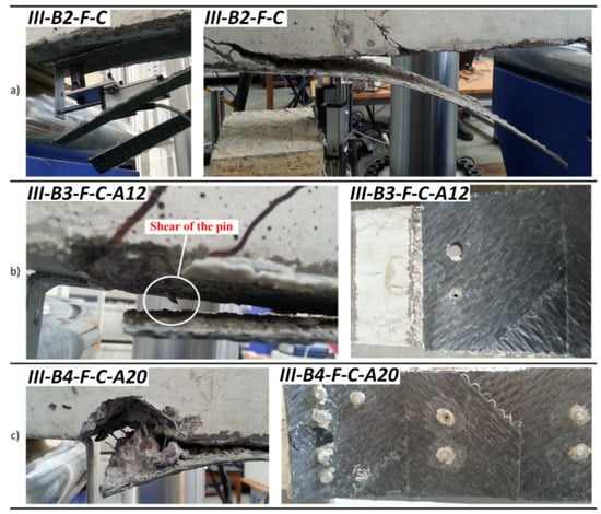 Failure of series “III” beams: (a) Beam with adhesively bonded CFRP sheet; (b) Beam with additional 2 × 6 pins fastening; (c) Beam with additional 2 × 10 pins fastening.