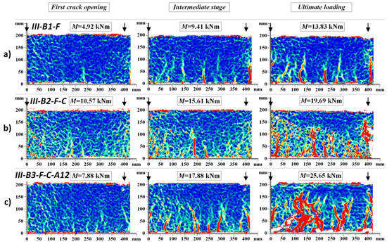 Development of cracks in series “III” beams identified using the DIC system: (a) Beam without external sheet; (b) Beam with adhesively bonded CFRP sheet; (c) Beam with the additional 2 × 6 pins fastening.