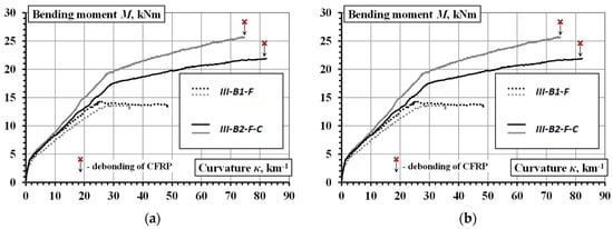 Moment-curvature diagrams of series “III” beams: (a) Beams without and with adhesively bonded CFRP sheets; (b) Beams with mechanically fastened CFRP sheets.