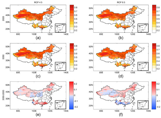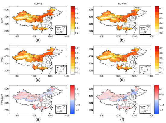 Figure 4 shows the geographic pattern of ecological vulnerability over a 30-year period. Interestingly, the spatial patterns in the hazard changes are similar between the two scenarios. The most ecologically vulnerable areas are concentrated in the Inner Mongolian Plateau (Figure 4a–d). To determine where the changes will be the greatest relative to the first half of the 21st century, two typical years of 2020 and 2050 were selected in this study (Figure 4e,f). The risk area is predicted to be distributed in most regions under the two emissions scenarios (RCP 4.5 and RCP 8.5).
