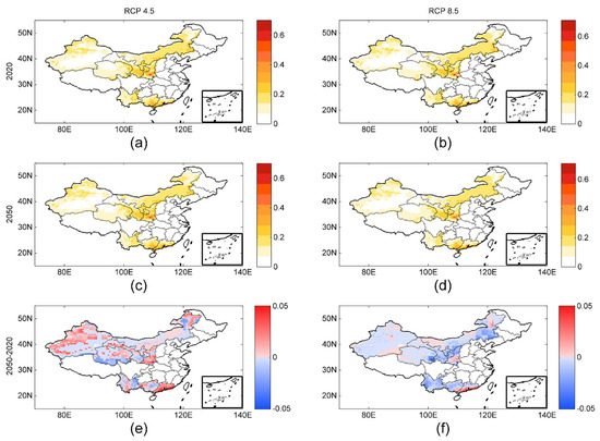 Risk estimates and changes in hazards in the future under different emissions scenarios. (a,b) and (c,d) describes the distribution of hazards in 2020 and 2050, respectively. In (e,f), the red grids indicate an increased hazard risk, and the blue grids indicate the opposite.